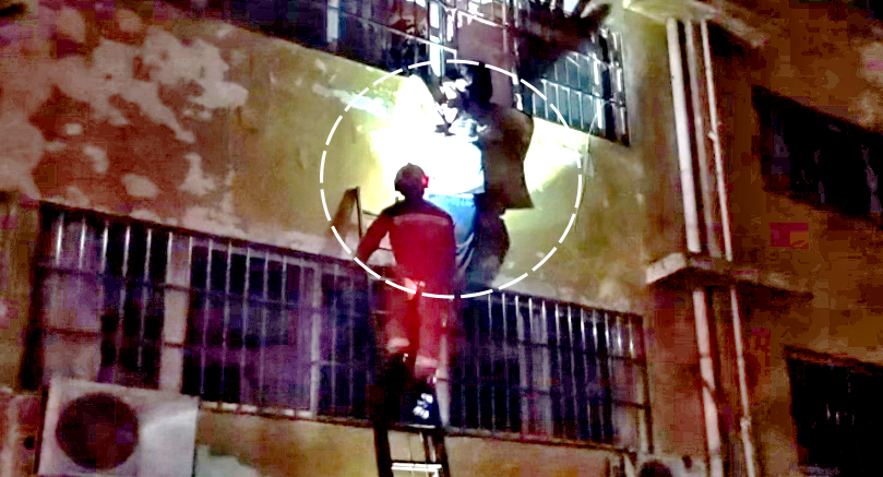 不料脚底打滑被困窗口