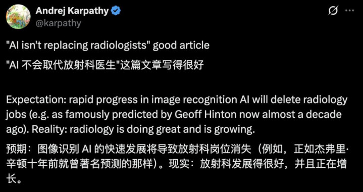 特斯拉前AI部门总监、OpenAI创始团队成员Andrej Karpathy在X平台上转发一篇「AI不会取代放射科医生」的博文,指出Hinton预言落空的原因。