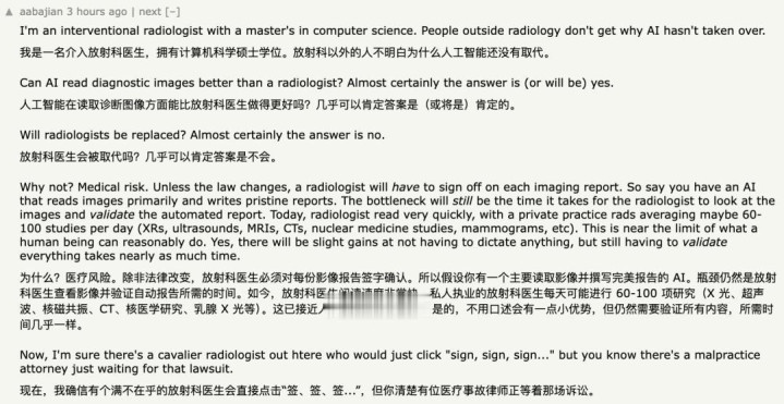 Hacker News中有一篇「对人类放射科医生的需求达到历史新高」热帖,一名放射科医生在下面留言: