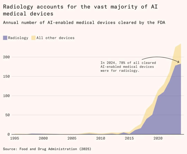 2016年后增长明显加速。2024年,所有获批的AI医疗器械中,有78%属于放射科。
